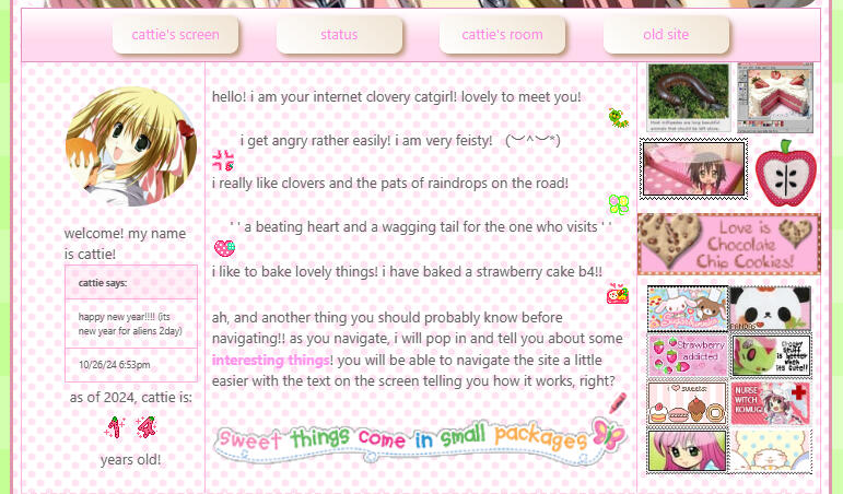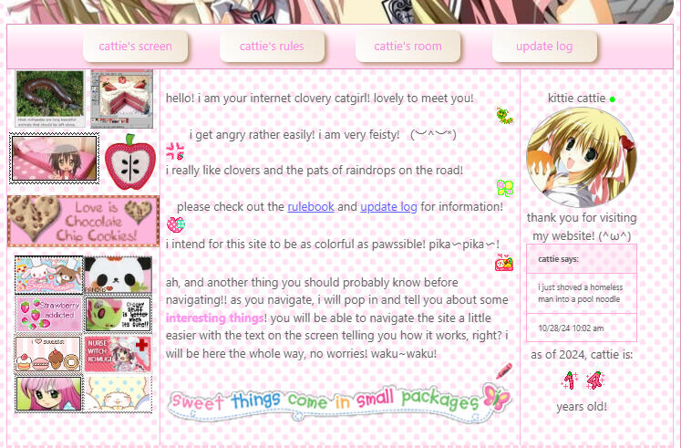 welcome to the virtual update letter, which tells you about the pawesome and nyandaful updates made to cattiegirl! <(●^⩊^)here, you will experience extensions of the update log on the main site! more detail will be given about each new thing added or taken, as well as reasoning as to why these changes happened and the before and after pictures (if necessary)! i hope you enjoy!also, this will be updated solely whenever a new thing is added that is major or slightly major to the site! smaller additions will be added on the original update log back over on cattiegirl! thanx u tons for understanding, nd please, only read if you are interested! feel no force, as this page holds not much value towards the original site unless you want to see what happens to the original site behind the scenes!